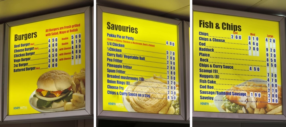 Nobbies specializes in fish and chips, but also serves a variety of burgers, savory snacks, and sides, totaling 38 options to satisfy any appetite.